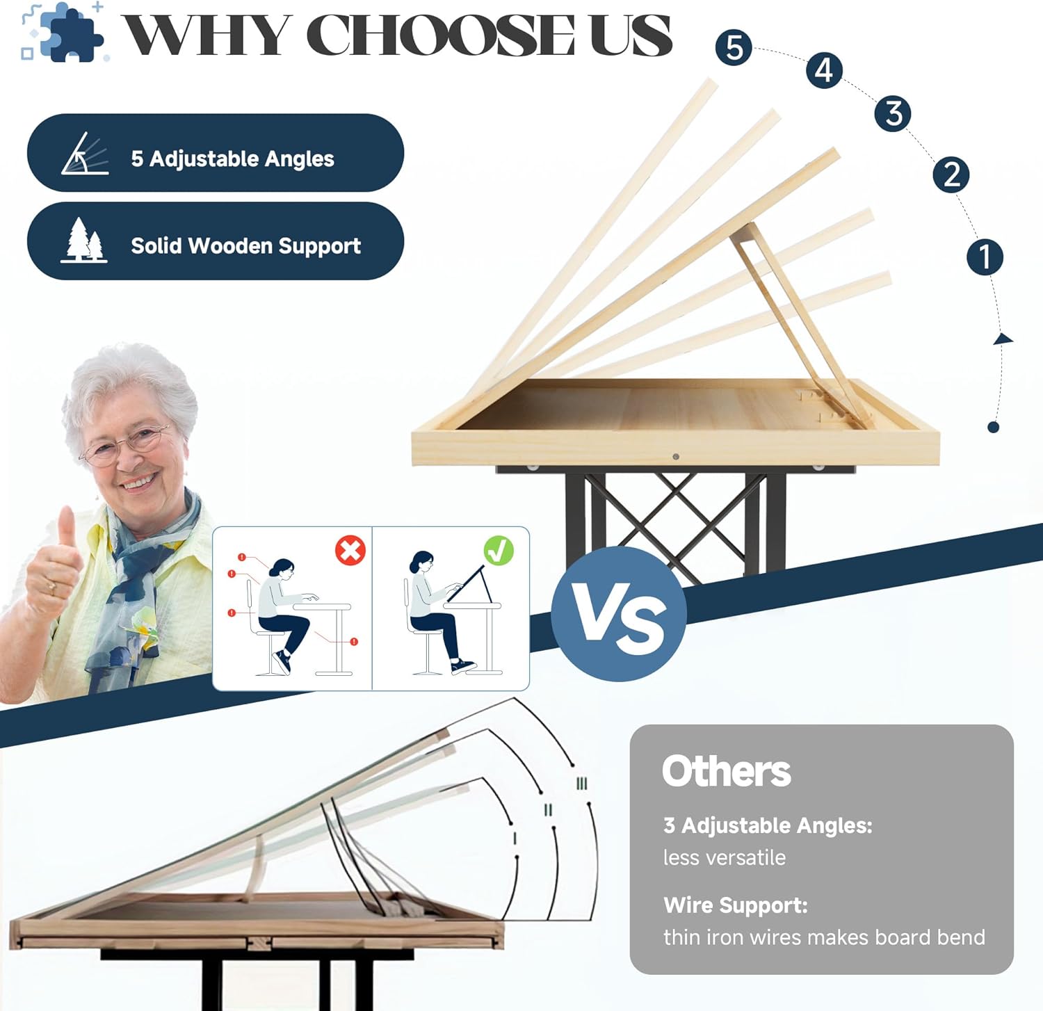 - 【Adjustable Angle and Height】 The tabletop of the Jigsaw puzzle table offers 5 adjustable angles, fully ergonomic, and its height can be adjusted from 27.6 inches to 34.7 inches. Suitable for puzzle enthusiasts of different heights and say goodbye to back pain and enjoy hours of puzzle solving fun